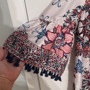 Anthropologie Jade multicolored floral Tunic w Mandarin Collar& tasseled sleeves