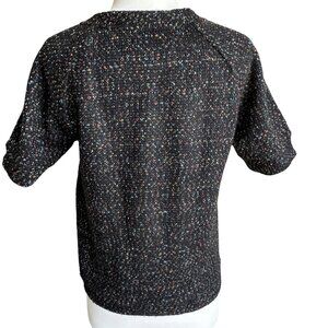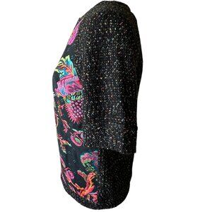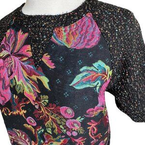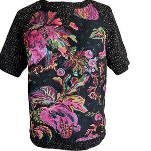 Elevate your wardrobe with this gorgeous James Coviello for Anthropologie short sleeve top in size Small. Features a vibrant floral velvet embroidered front panel with multicolor botanical motifs, contrasted by a textured knit back and sleeves with metallic threading for subtle sparkle. The perfect blend of romantic and edgy style.