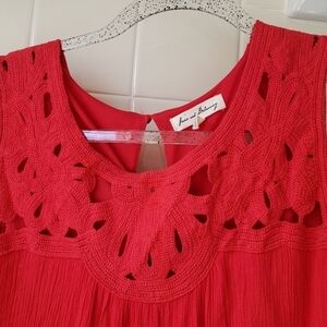 Red Dress from Jane and Delancey with a detailed crochet yoke to highlight your face. Sleeveless for those hot summer days. Dress is in excellent condition. 100% rayon, lined with 100% polyester.