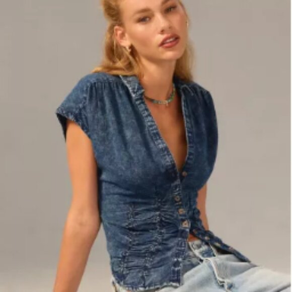 Anthropologie Jean Button Down with Pretty Neckline and Fitted Waist XS
