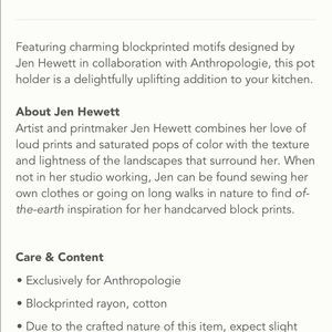 Anthropologie Jen Hewett Blockprinted Pot Holder Farmhouse New