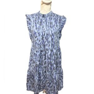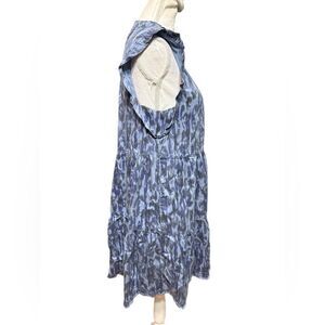 Great Preowned Condition * Blue Leopard Print * Ruffled Cap Sleeve * Tiered * Pintuck Front * Keyhole Back With 2 Button Closure * Band Collar * Chambray Fabric * Knee Length * 2 Pockets * Raw Frayed Hem * Tags: Animal Print, Leopard, Summer, Spring, Fall, Chambray, Travel, Career, Casual, * 100% Lyocell * Washable * Size S * Bust 34 * Length 35