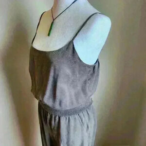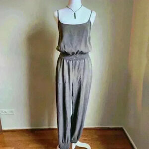 Gray / grey jumpsuit with a semi green hue to it. Not entirely visible in the photos. This one piece features an elastic waist, adjustable spaghetti straps, pockets, and elastic leg cuffs around the ankles. There may be regular signs of wear and tear (loose threads on the inside of the jumpsuit, worn out material / care tag, etc) but nothing too noteworthy. In good condition.
