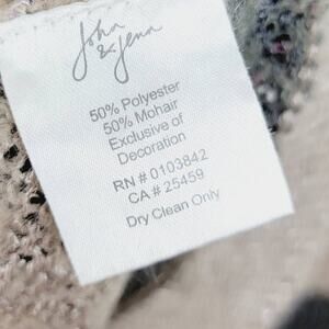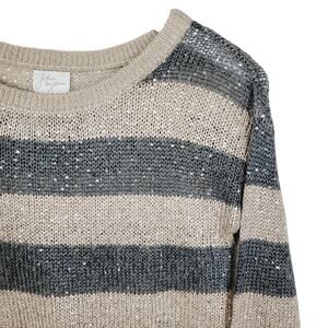 Anthropologie John & Jenn Mohair Blend Striped Crew Neck Metallic Sweater. 50% Mohair. 50% Polyester. Metallic accents. Soft, open knit. Gray and tan.