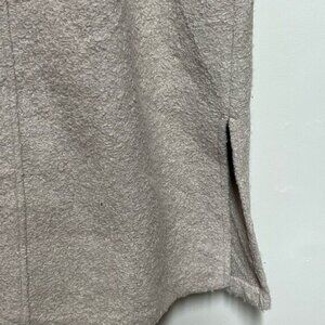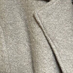 Beautiful minimal neutral coat featuring an open front with belt, side pockets and side slits. The wool is textured as pictured in the close up of the fabric.