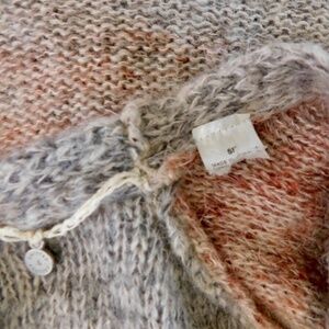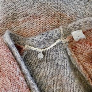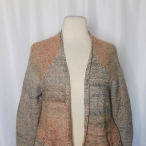 Open front … no closures ~ Long sleeves with raglan shoulder seams ~ Bottom part has a wide ruffled peplum hemline ~ Slip-On styling ~ Soft unlined knit fabric with mohair & wool in the knit blend ~ Marled ombre pattern in various shades of gray, orange, pink and rust