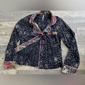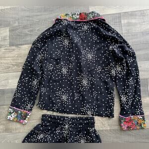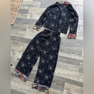 Size XXS two piece pajamas set that can be easily dressed up for a night out. Normal wear. Top is button down with stretch waist.