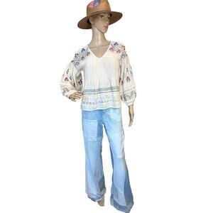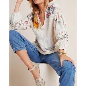 Anthropologie Kayla Top Size 2XS (Fits More Like a Small/Medium) Boho Peasant Lace Floral Embroidered Ivory Flowy Festive Blouse Puff Balloon Sleeve Slouchy Shirt RETAILS $138