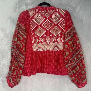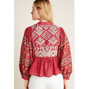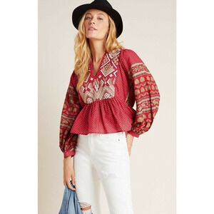 Anthropologie Keira 8 Embroidered Peplum Blouse Top V Neck Boho Balloon Sleeves