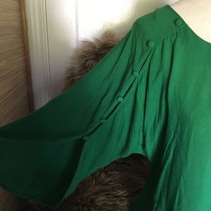 Soft Kelly green flowing fabric. Bottom of sleeves hit about mid forearm. Small gaps between buttons on sleeves. Extra button sewn to inner tag. This comes from a smoke free and pet free home and is freshly laundered.