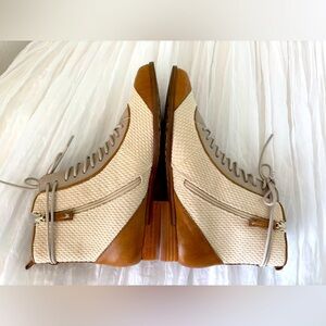 Anthropologie, Kelsi Dagger, Size 8, New without Tags/Box, Cream & Tan, Victorian Lace-Up Boots. Vintage-inspired with a modern kick, these lace-up boots add a trendy touch to dresses and denim alike. Textured canvas and leather uppers, zip sides and a big smile as you slip your feet into these beautiful boots…