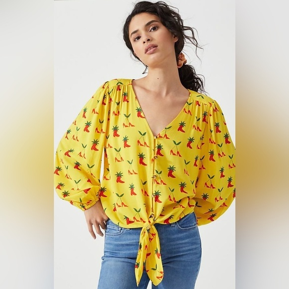 Anthropologie Kendra Dandy Dreamers Yellow Red Western Whimsy Blouse Size 10 - Viscose - button front that ties at hem, whimsical print, V-neck, elastic cuff sleeves