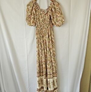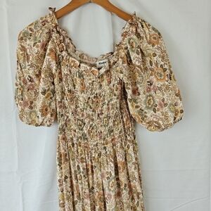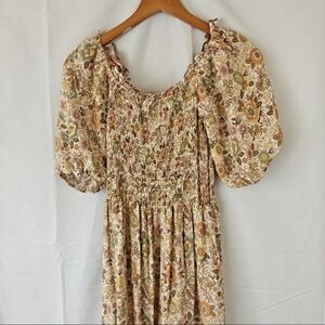 Anthropologie Kindred Shirred Puff Sleeves Midi Dress In Cream Floral Print Sz S