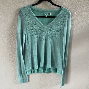 Condition: this nice dainty sea foam green sweater with pointelle design is in very good used condition.. actually never worn with extra yarn bag still attached but with a tiny puncture hole on Bottom sheer hem . Sleeves are sheer with lined bodice