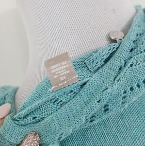 Anthropologie Knitted & Knotted teal Kose Cardigan. Aqua / teal blue green color lightweight knit. Open front cardigan with front belt. Pointelle knit with Pom Pom detailing. Long sleeves. Pointelle knit detailing on back hem.