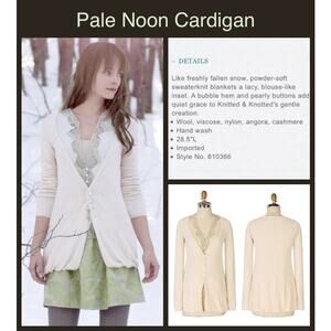 Add romantic charm to your wardrobe with this Knitted & Knotted "Pale Noon" cardigan from Anthropologie. Crafted from a luxurious wool-angora-cashmere blend, this sweater features a delicate lace blouse-like inset, pearlized buttons, and a flattering bubble hem. Perfect for layering or wearing as a statement piece in cozy, vintage-inspired outfits.