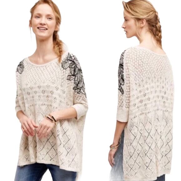 Slouchy Loose fit Anthropologie Knitted & Knotted Luana Embroidered Boho Sweater Tunic XS S Ivory