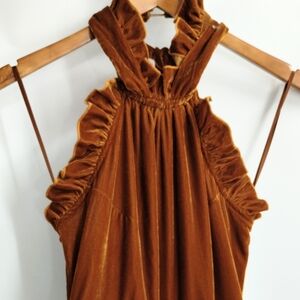 Anthropologie Kristinit Gold Velvet Wide Leg Halter Jumpsuit. Soft golden brown velvet, ruffled neck collar, neck tie strap, elasticized back hip pockets, wide leg cropped pants, invisible side entry zipper.