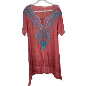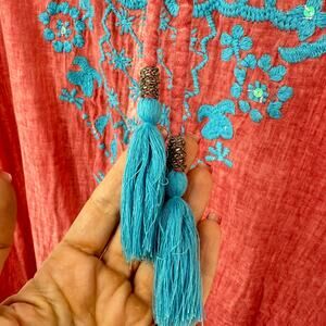 Anthropologie Kyla Seo Josephina Embroidered Dress Coverup Boho Beach Coral Blue