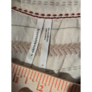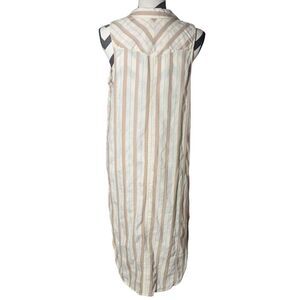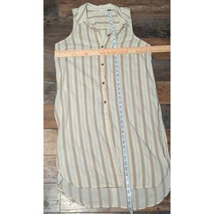 Embrace effortless bohemian charm with this versatile Anthropologie sleeveless tunic dress! The moment you see its calming blend of vertical stripes and subtle chevron-like textures in soft cream and beige tones, you'll feel an immediate pull to its relaxed elegance. Designed with a classic collar and a full button-front, this piece can be styled in countless ways: wear it as a lightweight mini dress, layered open as a duster over a simple outfit, or as a flowing tunic over leggings or jeans. Its breathable, lightweight fabric is perfect for warm weather, travel, or simply adding a touch of laid-back sophistication to your everyday. Imagine the comfortable drape, the easy versatility, the feeling of relaxed chic. You deserve clothing that moves with you and adapts to your unique style. This isn't just a tunic; it's a feeling of carefree comfort, an expression of versatile fashion, and an irresistible addition to your wardrobe that will become a go-to favorite.