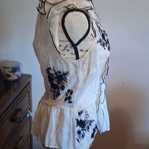 This elegant cream blouse from Anthropologie features a sleeveless design with a flattering peplum silhouette. The ruffled details add a touch of sophistication, making it perfect for both casual and formal occasions. Its fitted style ensures a chic and polished look.