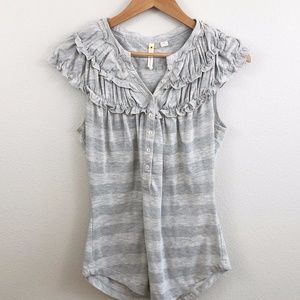 GUC with ruffles and cap sleeves. Machine wash cold; tumble dry low.