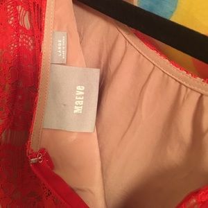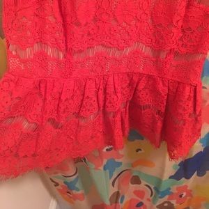 Orangey-red lace peplum blouse from Anthropologie. Tag says it's from designer Maeve. Size Large. Back zipper. Only worn a few times! Item comes from smoke-free home.