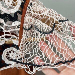 This Anthropologie rust-orange top features intricate lace detailing and a soft fabric blend for stylish comfort. Ideal for casual or semi-formal settings.