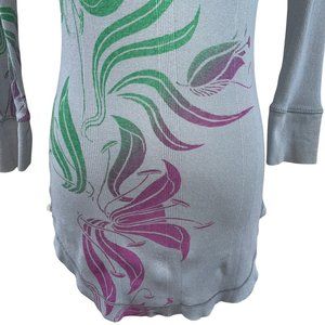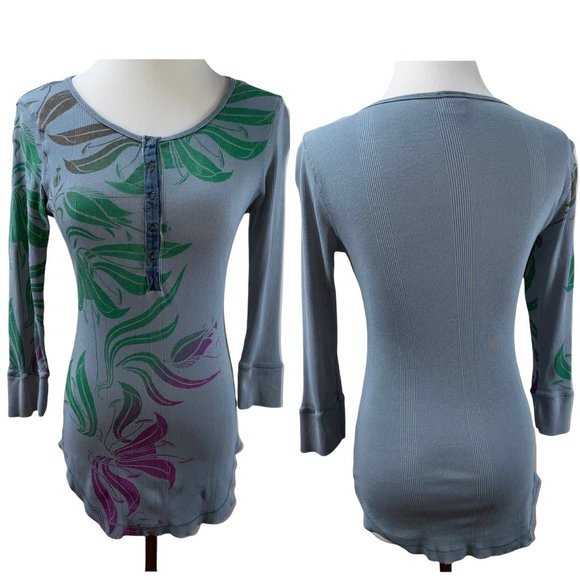 Anthropologie Language Knit Top. Soft, stretchy and lightweight. Henley neckline with contrast fabric. Graphic botanical / floral print. Cotton knit does stretch. Longer length. 3/4 sleeves. Blue.