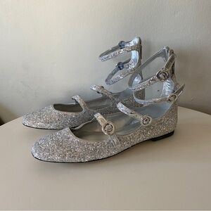 Anthropologie Larroude Alexa Flats 4 Buckle Ballet Silver Glitter Size 11 NWOT