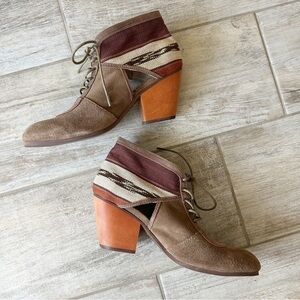 Anthro Latigo suede and Southwest textile lace up booties. Size 9. Great preworn condition. Light scuffing of suede and heels.