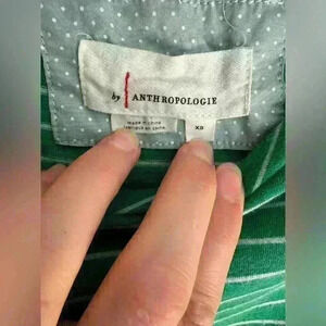 This cute top is size XS with green and white stripes made by Anthropologie. There are ruffles on the back side for a fun look and it hangs slightly lower in the back than the front. It is 85% cotton and 15% polyester. Pre-owned in good condition. There is one small pinhead sized hole near the bottom of the shirt as shown in the last picture. See pictures for measurements.