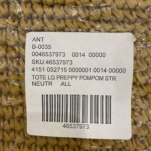 Beautiful summer tote offered by Anthropologie. Approximate total size 21”w x 23 1/2” h, including the pom poms and the handle