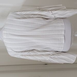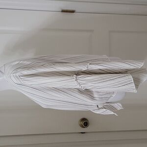 Anthropologie Lavender Field Size L Linen Blend Striped Bell Sleeve Tie Front Top. Excellent Used Condition. No Holes, Rips, Stains or Snags. V Neck, Bell Sleeve, Tie at Front Waist. Ecru with Gray and Blue Stripes. Please refer to measurements in photos to ensure proper fit.