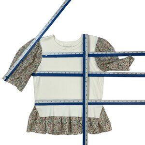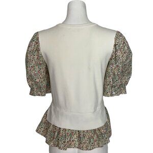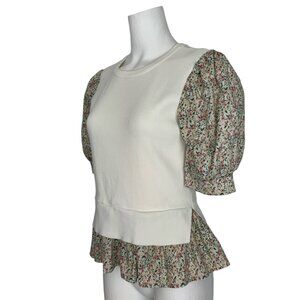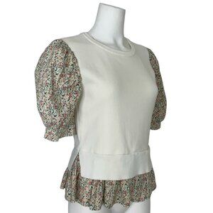 This By Anthropologie women's Layered Poplin-Sleeve Sweater makes a statement due to it's floral puff short sleeves, crew neckline, pullover fit, floral peplum hem and cream knit bodice.