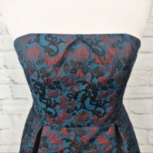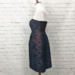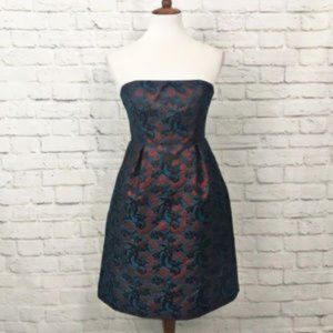 Beautiful strapless metallic dress from Anthropologie brand Leifnotes. Excellent Condition! Teal and Burgandy brocade fabric. Smocked back with back zip closure. Hidden hand pockets. Fully lined. Pleats to add volume. Approximate measurements laying flat: armpit to armpit 14”, waist 13”, total length 28.5”. Bundle and Save!