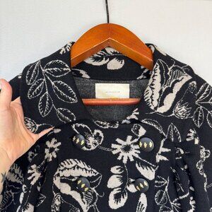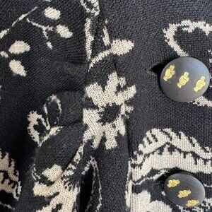 This Leifsdottir Cardigan Sweater Caplet from Anthropologie is constructed in 100% Wool black & Ivory passerine bird floral print knit fabric. It features an oversized spread collar, double breasted oversized gold 3 bird button front closure, wide elbow length gathered raglan short sleeves, fitted bodice and a capelet cropped silhouette. This is boho, artsy, layering, avant garde, modest, office, holiday party, day to night, office, work events/meetings, y2k, gossip girl, whimsical, neutral vibes.