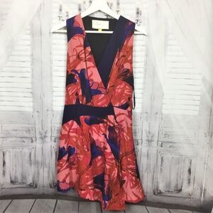 Leifsdottir for Anthropologie malva red, blue and coral crossover style dress. Hi lo effect on the hem, sleeveless with a deep V. 100% silk with an elastic part on the back to help with fit. Floral tropical pattern. Good used condition, no issues.