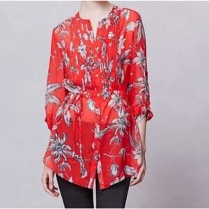 Anthropologie Leifsdottir Red Silk Floral Pleat Button-Up Tunic Top Size 4