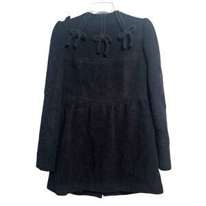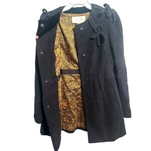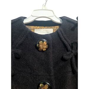 Description: Anthropologie Leifsdottir Wool Peacoat in Black, size 4, used with good condition. Features triple wool blend (virgin wool, alpaca, mohair), fully lined, snap button closure, cute bow details on front and back, perfect for stylish cold-weather wear despite top button being slightly loose but fully functional. Smoke-free home, fast shipping, bundle to save!