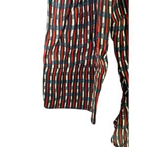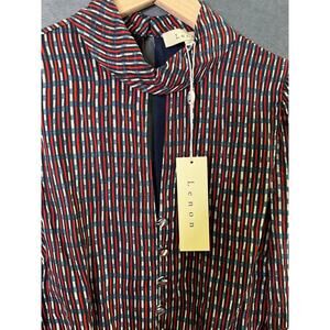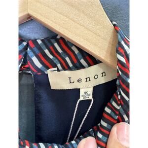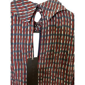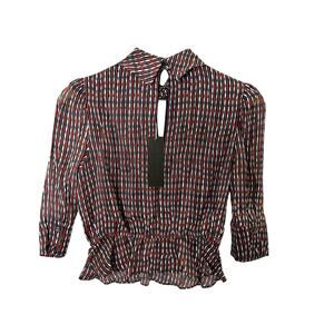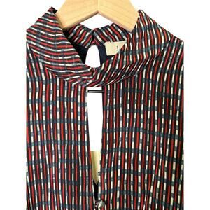 New with tags Anthropologie Lenon blouse, size XS. Features a bold striped pattern with a mix of red, blue, and white hues. Designed with a high neck, keyhole front, puff sleeves, and a peplum waist for a flattering feminine silhouette. Perfect for workwear, going out, or elevating casual outfits.