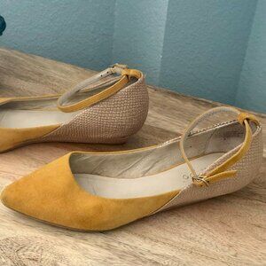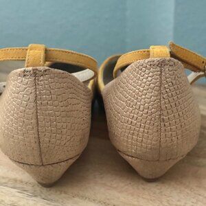 Add a refined pop of color to your look with these Anthropologie Lien.Do Cordoba Mini Wedges. Designed in rich mustard suede with textured blush-toned heels, these pointed-toe shoes combine a feminine silhouette with all-day comfort.
