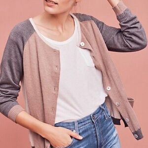 Anthropologie Lilia’s Closet cotton blend colorblock cardigan sweater top. Size Small. Oversized, boxy swing fit. Neutral brown, cream and grey heathered fabric colorblock pattern. Mother of Pearl button front closure. Tab slit detail at waist. Front functional pocket. Lightweight and very soft cotton blend fabric. Can be worn as a cardigan, or buttoned as a knit top. Knitted banding at cuffs, neck and hemline.