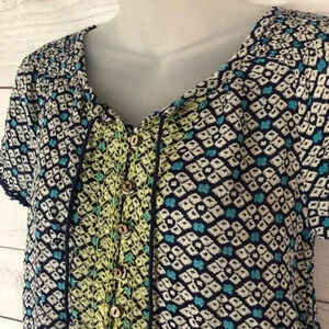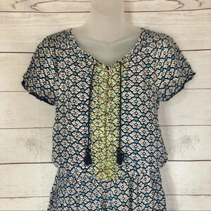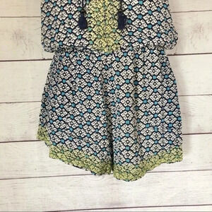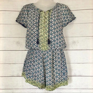 Anthropologie Lilka Blue & Green Printed Long Weekend Short Sleeve Romper S