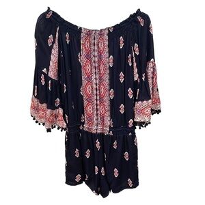 Anthropologie Lina Vada Boho Print Bell Sleeve Pom Pom Romper Black Red SZ M