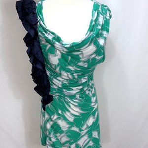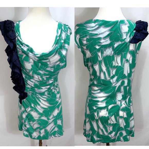 Cute Little Yellow Button Knit Top from Anthropologie. Ruched alongside ruffle for a flattering fit. Knit is soft, lightweight and stretchy Viscose. Long length. It is long enough that it could be worn as a dress. Abstract print with solid contrast. Green, white, blue.