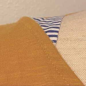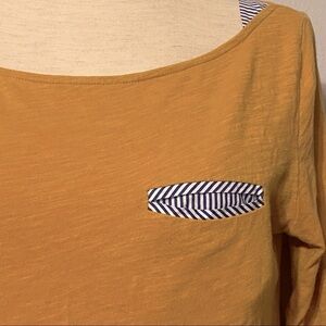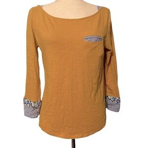Anthropologie Little Yellow Button mustard orange top with contrast striped/floral cuffs/pocket/neckline size small. Great condition see photos for details. Style OB449886 -