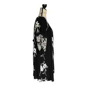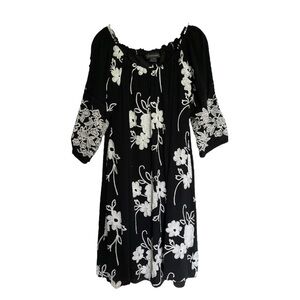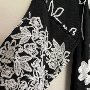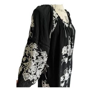 Beautiful Anthropologie Liv Los Angeles embroidered boho dress in classic black with white floral stitching. Features a relaxed peasant silhouette with elbow-length sleeves and full lining for comfort. A timeless piece for resort wear, casual events, or date night.