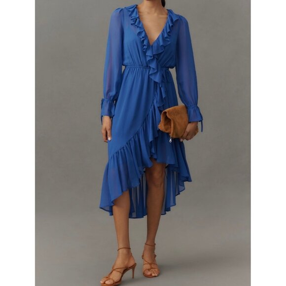 Elegant and versatile, this Anthropologie dress features a flattering wrap-style silhouette with ruffled details.