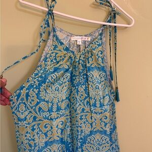 Stylish sleeveless dress with a blue and green pattern. Perfect for casual outings. Silk and polyester. Tie top.